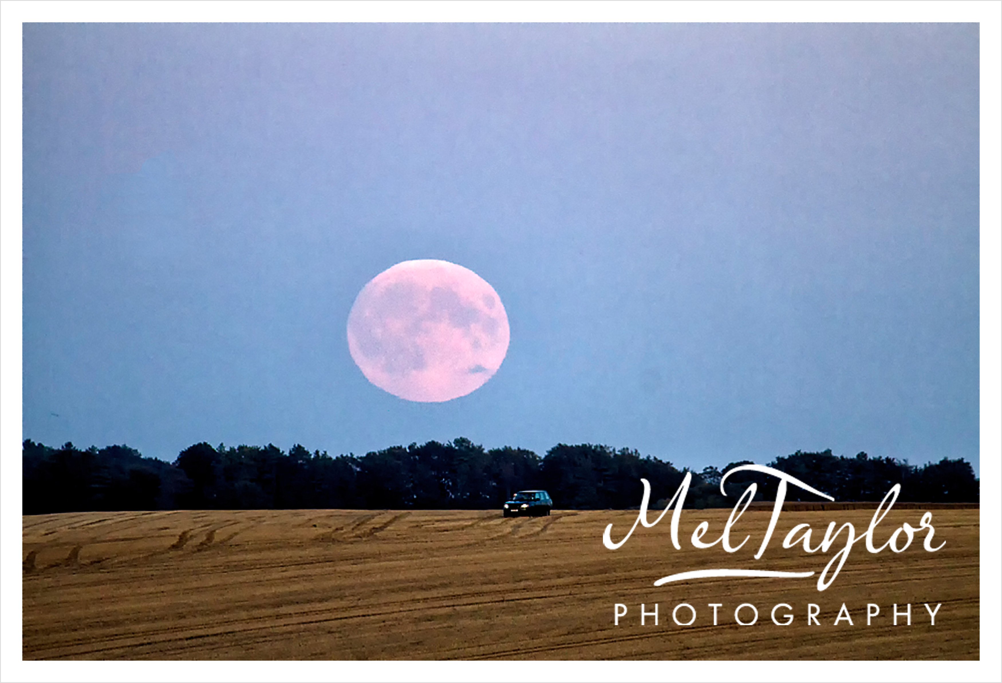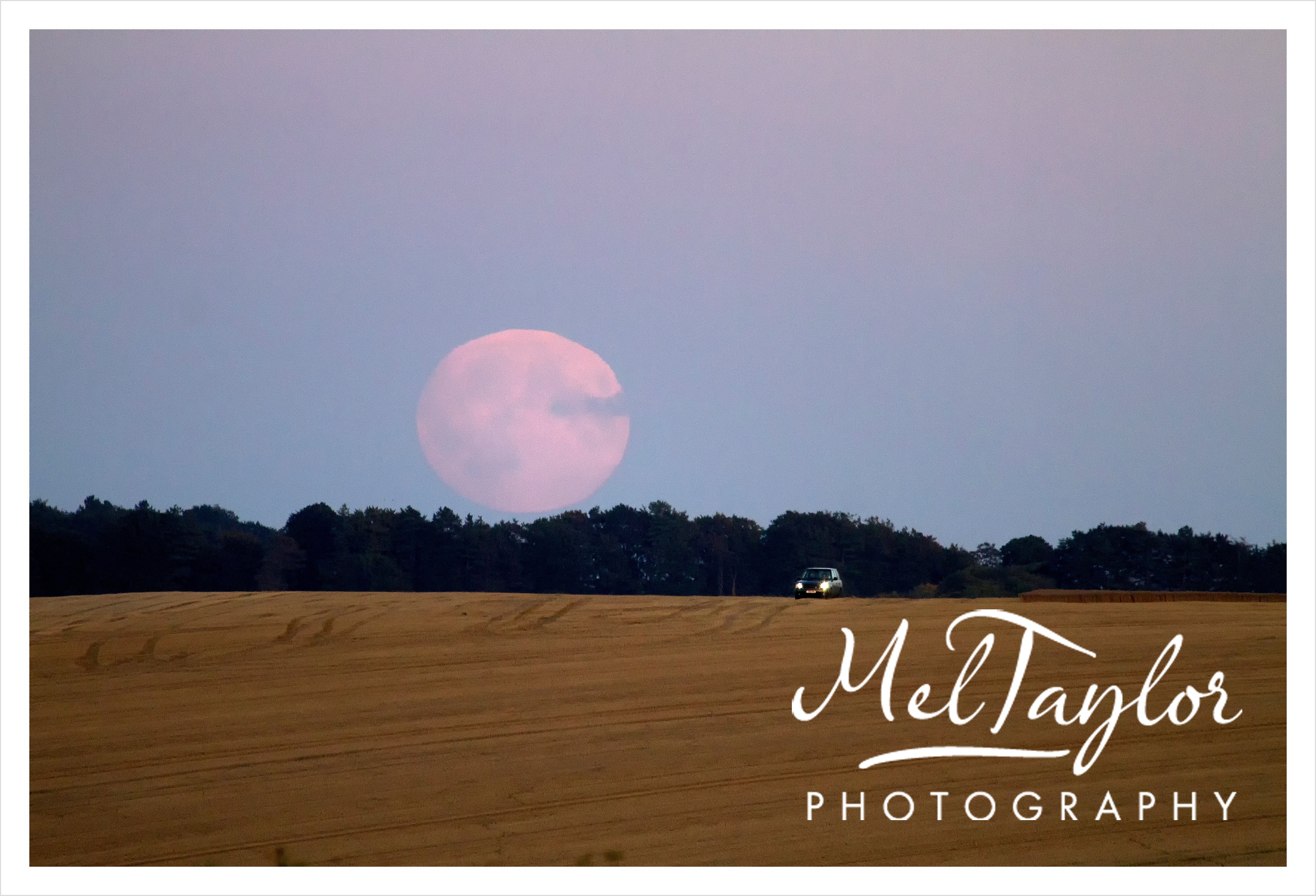 We nearly missed the Moon rising as we were the other side of the road watching the sun set. The moon rises very quickly and was just poking above the hedgerow when we spotted it and by the time I got the camera sorted it was just above.